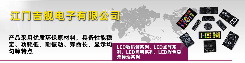 江門吉艦電子有限公司專業銷售LED數碼管、點陣 、彩屏等顯示器件、套件及LED照明電子元件。產品采用優質環保原材料,具備性能穩定、功耗低、耐振動、壽命長、顯示均勻等特點。廣泛應用于家用電器、LED顯示屏、電梯控制、儀器儀表等行業。江門吉艦電子有限公司憑借對光電行業豐富的系統經驗,贏得了客戶的廣泛認同和贊譽,卓越的產品質量、合理的價格深受客戶的好評。